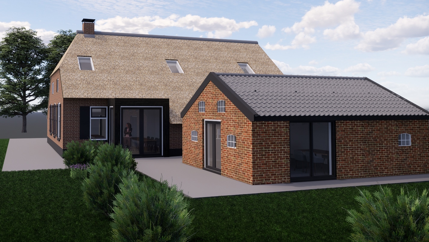 Een opdrachtgever uit Zuid-Drenthe bewoont het voorhuis van een grote riet-gedekte boerderij.