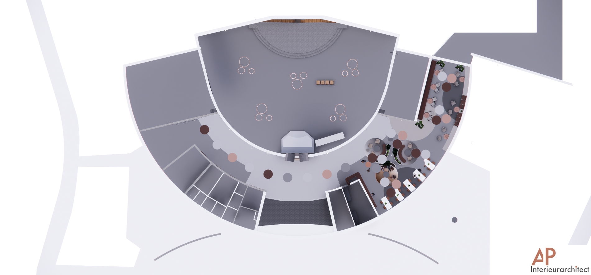 De kerk De Voorhof uit Assen heeft AP-Interieurarchitect gevraagd een ontwerp te maken voor een nieuwe ontmoetingsruimte. Het gebouw is gebouwd in 1995 en in de vorm van een halfronde cirkel , wat in de binnenruimtes ook weer terugkomt.